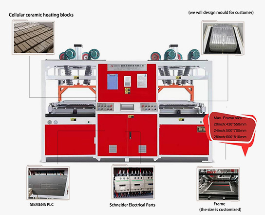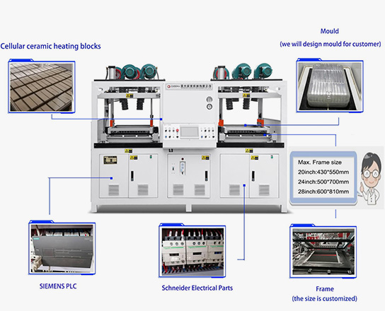 Машина для вакуумной формовки багажа Chaoxu использует систему управления PLC, гидравлический привод и оснащена верхними и нижними нагревательными элементами, что повышает прочность и ударопрочность багажа. Подходит для формовки листов из ABS, PC или переработанных материалов.